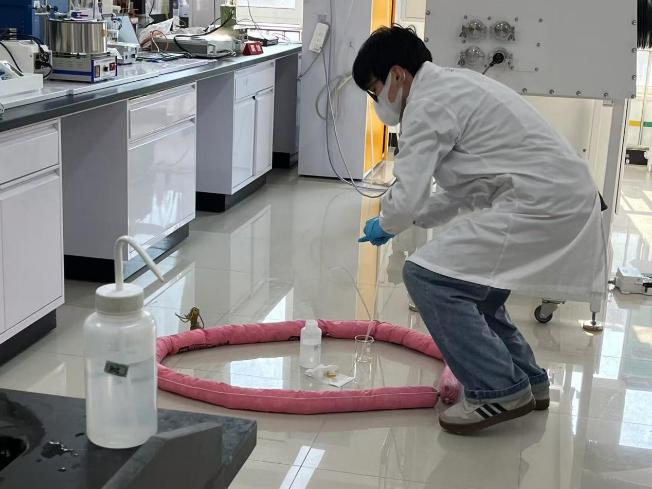 现场演练环节聚焦两大核心场景精准开展。在能源电力创新研究院一级实验室,模拟氢气钢瓶管路泄漏的紧急情况:现场监测设备发出报警后,实验人员立即启动应急程序,佩戴专业防护装备,快速关闭气源总阀、切断周边电源,关上气瓶间防爆门,同步疏散无关人员并设置警戒区域,等待专业人员现场清理及善后,同步按规范流程上报应急指挥部,整个处置过程快速、规范、有序。在危化品泄漏演练区域,模拟腐蚀性试剂浓硫酸泄漏场景,参演人员严格遵循“隔离污染区—穿戴防化服—使用吸附棉吸附—规范收集废弃物”的操作流程,在专家指导下完成泄漏试剂的安全处置,有效避免污染扩散与人员伤害。